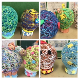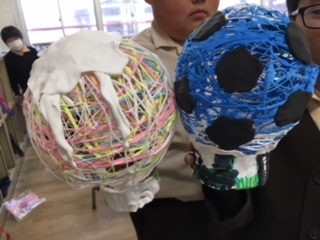 風船と紙粘土を使って「おしゃれなランプ」を作っています。風船に紙粘土を糸状にして巻きつけ、乾いたら風船をわります。動物やいろんな友達の顔などそれぞれの思いがこもっているすてきなランプです。