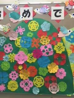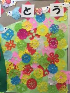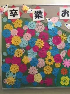 全員で作った折り紙の飾りで、花をイメージしています。6年生みんなに幸せの花が咲きますように!