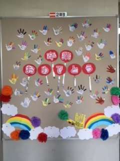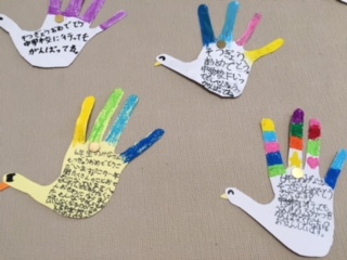 2年生一人一人の手にメッセージが書いてあります。ハッピータイムのこと、優しくしてもらったこと、中学校に行っても頑張ってくださいなどのメッセージがたくさん書いてあります。
