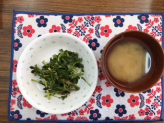 学習園で育てた田辺大根を使って、みそ汁と菜の花のおひたしを作りました。菜の花はほろ苦くて、ちょっぴり大人の味です!田辺大根は、小さめでしたが、たくさんできたので美味しくいただきました!