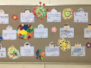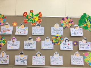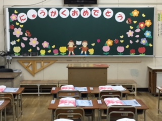 新6年生が手伝って、明日の入学式準備を行いました。後ろの掲示板には、新2年生からのメッセージを貼っています。
