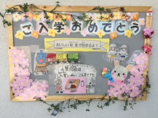 給食室前の掲示板には、栄養教諭や調理員さん達が入学・進学を祝って可愛らしい掲示をしてくれています。今日から始まった給食。何でもバランスよく食べて、元気に、大きくなあれ!