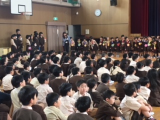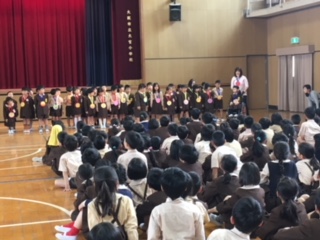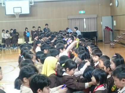 1年生の先生から、1年生に関する話がありました。続いて2年生の子ども達が歓迎の気持ちを込めて作ったメダルを一人一人にプレゼントしました。