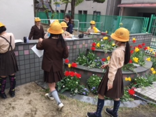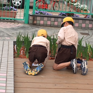 春の自然観察をしました。ビオトープの花やメダカなど、冬の様子から変化していることを見つけました。「メダカが、集団で泳いでいる!」と発見した子もいました。