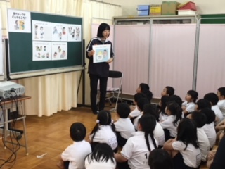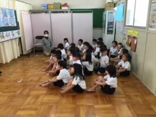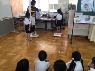 保健室のH先生から、保健室はどんなところかという説明を聞きました。続いて正しい手洗いの仕方をビデオで見て確認しました。最後は、身長と体重を測りました。しっかり静かに話を聞くことができています。体重計にのるのも、前の人がすることをよく見ていて、スムースに進みました!