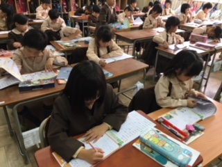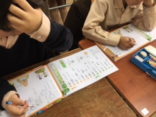 「漢字ドリル」と「ことばのドリル」を一人一人自力で解いていました。1年生で習った漢字を使った文で、主語と述語がきちんと合っているかを問う問題が出ています。こういう問題は、昨日6年生が受けた全国学力・学習状況調査問題にも出ていました。文を読んで、「おかしいな・変だな」と感じること(言語感覚)もしっかり身につけさせたいです。