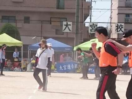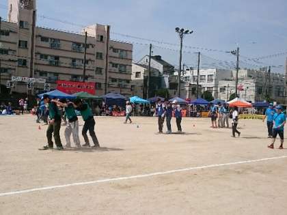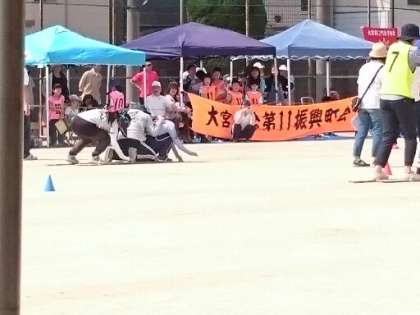 むかで競走です。3人が息を合わせて前に進みますが、なかなか難しいです。先生チームも参加しましたが苦戦しました。
