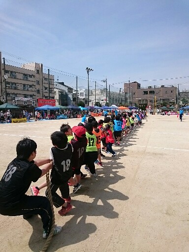 綱引きです。大人数で力を合わせ、綱を引っ張り合います。腰を落として、力強く引けました。