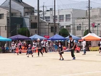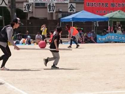 ボールみこしです。ボールが落ちないよう、バランスよく運びます。