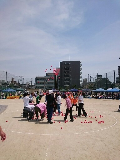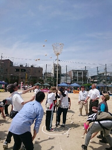 紅白玉入れは来賓・役員の方々の参加競技です。大人用に設定されたかごの高さはとても高く、玉を入れるのに一苦労でした。