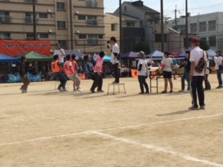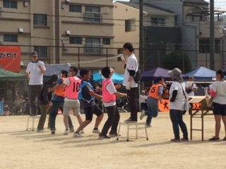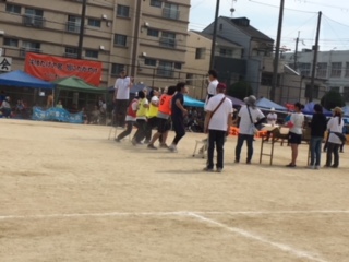 パン食い競争は、紐が揺れるとなかなか掴みにくいものです。地域運動会ならではの競技ですね。見ている方も楽しいです。