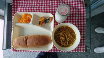 ベーコン、鶏肉、たまねぎ、にんじん、ピーマン、しめじが入った具だくさんのスパゲッティが食欲の進むカレー味で登場しました。どのクラスも食缶空っぽでしたよ。
