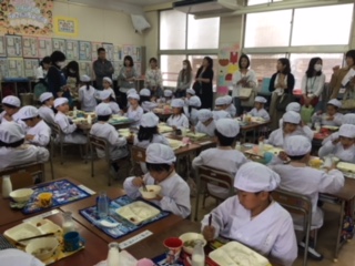 お家の人に見守られながらの給食。ちょっといつもより緊張気味、でもとってもうれしそうな1年生でした。当番活動や、きちんと座って待つことなどもしっかりできてきています。