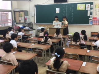 水曜日の8時30分から45分まで全校児童が「読書タイム」で好きな本を読んでいます。1年生の教室には、高学年の図書委員会児童が、紙芝居の読み聞かせをしに行っています。食い入るように見つめ、お話の世界に浸っている1年生です。この経験が、読書好きに育っていくもととなっています。