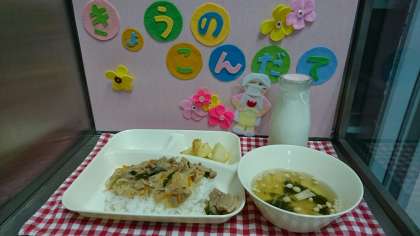 今日の献立は、豚丼、ゆばのすまし汁、焼きじゃが、牛乳でした。