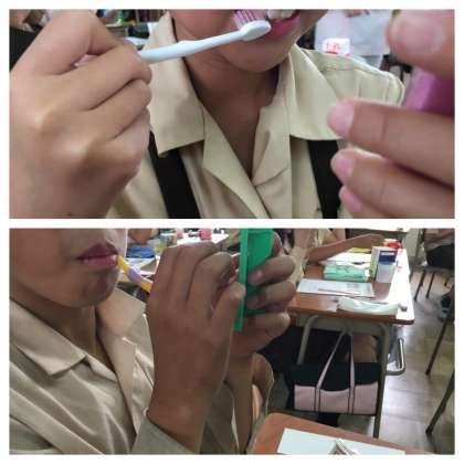歯科衛生士さんが、歯磨きの仕方について指導してくださいました。2年生の時にも一度学習をしています。染め出し剤を使って歯垢の染色を行いました。朝から、歯磨きをして登校していても、結構ピンク色に染まっています。鏡を見ながらチェックし、その後歯ブラシでしっかりブラッシングをしました。