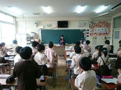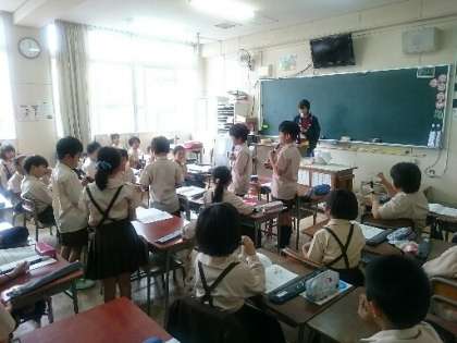 クラスを半分に分けて、どのように吹いたら美しい音が出るか聴き合いました。友だちの音をよく聴いて、いい音が出た子にどうやって演奏したか聞いてみると、「優しく吹く」という答えが返ってきました。そのアドバイスを意識して吹くと、美しい響きが生まれました。