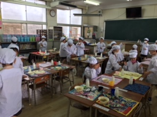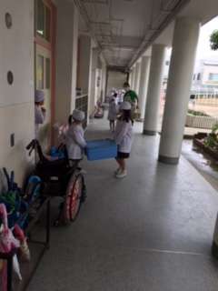重い食器かごやおかずの食缶も2人でで協力して運んでいます。当番活動が、とても上手になってきました。