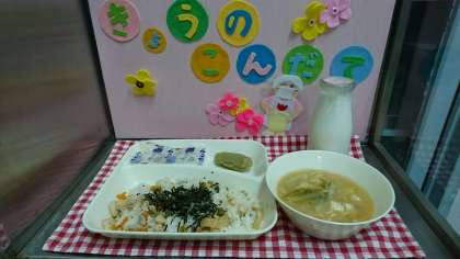 今日の献立は、かやくご飯、みそ汁、まっ茶ういろう、牛乳でした。