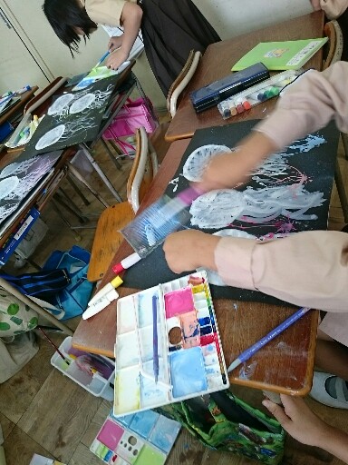 ビー玉転がし、スパッタリング、吹き流しの技法を学習した3年生。黒画用紙に白いクラゲを描いて、思い思いの工夫を生かして表現しています。おもしろい世界ができあがっています。