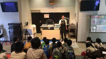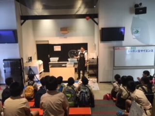 大阪市立科学館へ行きました。まず最初にサイエンスショーを見ました。「わくわく、キラキラシャボン玉サイエンスショー」というテーマでいろいろな形のフレームで作った大小のシャボン玉を見せてもらいました。三角や四角などフレームの形は違っても、みんな丸くなるのは表面張力のせい、ということを学びました。お家でもやって見たいと思った子もたくさんいました。