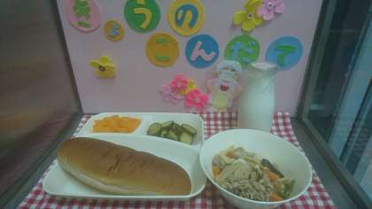今日の献立は、八宝菜、きゅうりの中華あえ、みかん(缶詰)、黒糖パン、牛乳でした。