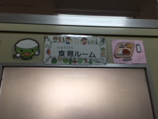 今年から一階、管理作業員室横に「食育ルーム」ができました。栄養教諭のF先生がいろいろ工夫してくださっています。