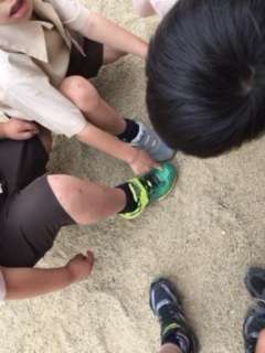 元気に遊んでいます。靴を指差しながら、おにごっこのオニを決めているようです!
