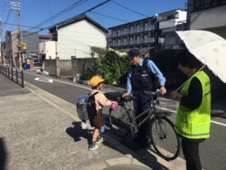 今朝も旭警察署のおまわりさんが、校区内を巡回して子ども達の安全を見守ってくださいました。「自分の身は自分で守るように、しっかりアンテナをはる事が大切ですね」と話されていました。