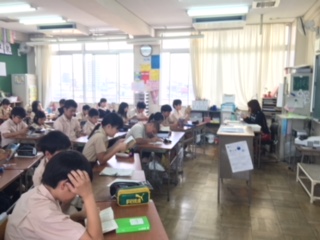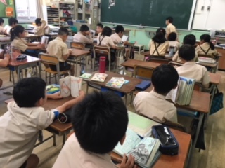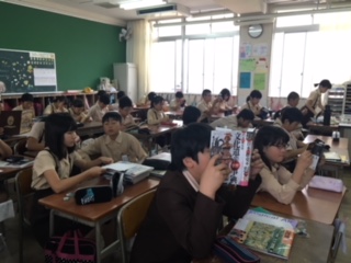 高学年の教室の風景です。家から持って来た本、学校の本、旭図書館で借りた本など様々です。短い時間を有効に使っています。