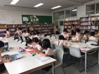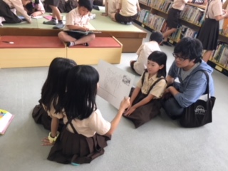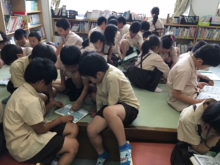雨が降っていたので、昼休みの図書館は、大にぎわいでした。紙芝居を読んであげる姿も見られました。