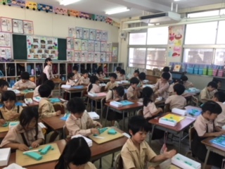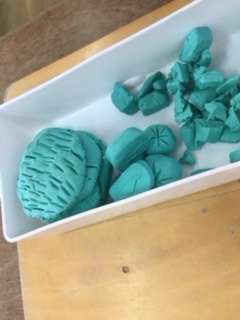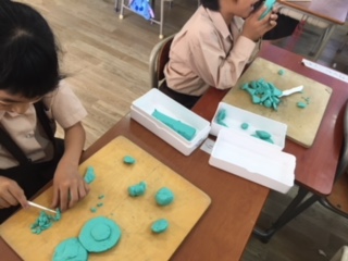 初めて粘土を使いました。かたまりでとても硬いので、ちぎったり丸めたりのばしたりしながら好きなものを作っていました。ハンバーガー、シチュー、お菓子、ヘビなど様々です!