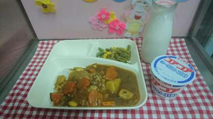 今日の献立は、牛肉と大豆のカレーライス、三度豆とコーンのサラダ、ヨーグルト、牛乳でした。