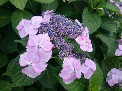 アジサイの花びらに見える部分は、実は「ガク」だそうです。では、アジサイの花は一体どの部分なのでしょうか?調べてみてください。