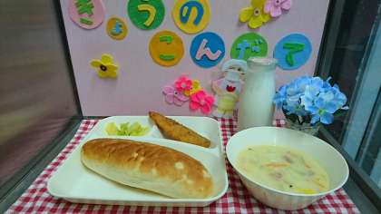 今日の献立は、サーモンフライ、豆乳コーンスープ、キャベツのカレーソテー、おさつぱん、牛乳でした。