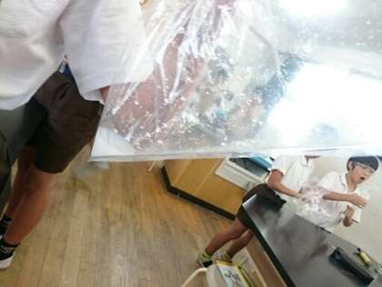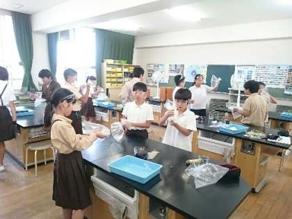 呼吸についての学習です。吸う空気と吐いた息にちがいがあるのか調べました。ビニール袋に空気と吐いた息を別々に取り込み、石灰水や気体検知管を使ってそれぞれの成分を調べました。結果は子どもたちの予想通り、吸う空気より吐いた息の方が、二酸化炭素が多く酸素が少ないということがわかりました。班の子と協力して、安全に手順を確認しながら実験することができました。子どもたちは実験が大好きです。