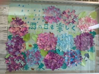 近畿地方もいよいよ梅雨入りしたとニュースで報じられています。玄関にアジサイをテーマにした掲示物が飾られ、季節を感じます。雨の日が多くなりますが、植物や作物にとっては恵みの雨。子どもたちにとっては外遊びができない分、悲しみの雨かもしれません。でも、教室で楽しく安全に過ごせるよう考える良い機会です。梅雨での楽しみを見つけてみましょう。