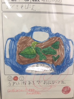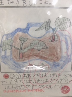 5月に蒔いたアサガオが大きくなり、間引きをしました。間引いた苗は、お家で育てます。双葉と本葉の違いも感触で確かめました。