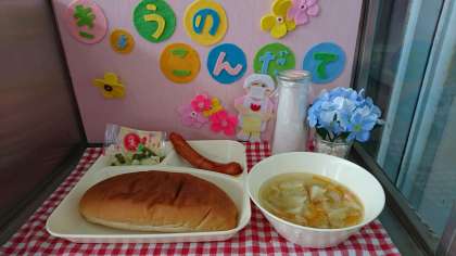 今日の献立は、ウインナーのケチャップソース、野菜スープ、じゃがいもと三度豆のサラダ、黒糖パン、牛乳でした。