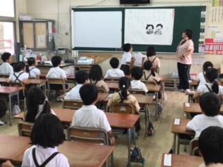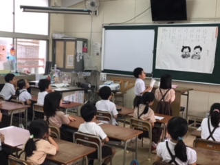 「あいうえお」の詩を日直さんのリードでみんなで読んでいます。口の形に気をつけて、みんな大きな声で読んでいます。「あいうえお」は母音で、日本語のお母さんです。と、詩にあります。