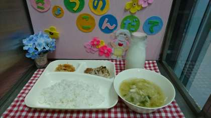 今日の献立は、豚肉の梅風味焼き、すまし汁、切り干しだいこんのいため煮、ごはん、牛乳でした。