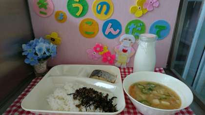 今日の献立は、さごしの塩焼き、みそ汁、牛ひじきそぼろ、ごはん、牛乳でした。