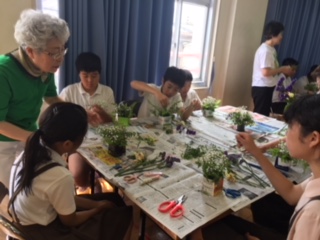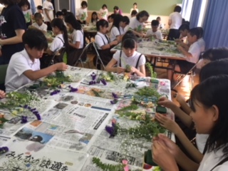 今日の花材は、スプレーカーネーション、スターチス、アルストロメリア、ツディ、アイビー、かすみ草です。みんな思い思いに生けていきました。