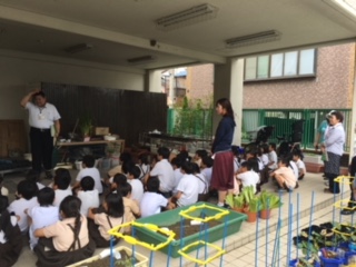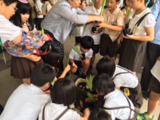 3時間目、旭区役所と鶴見緑地公園事務所、大宮地域花ボランティアさんが来校され、ショウブの株分けを教えてくださいました。