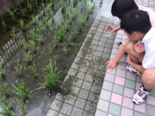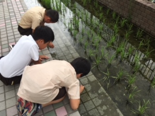 ビオトープの田んぼのそばで、5年生が何やら探しています。のぞくと、ガラスの瓶に、田んぼの水を入れていました。