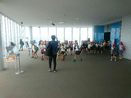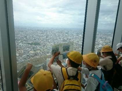 エレベーターで60階まで上りきった子どもたち。フロアに出ると、目の前に広がる、地上300mからの光景に思わず歓声があがりました。