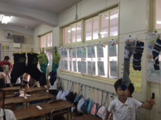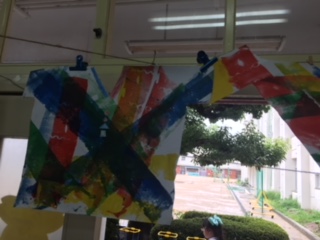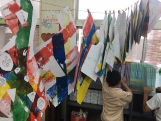 図國の時間、ローラーを使ってTシャツの形に切った画用紙にもようを描きました。カラフルな素敵なシャツが教室に並んでいます。