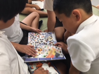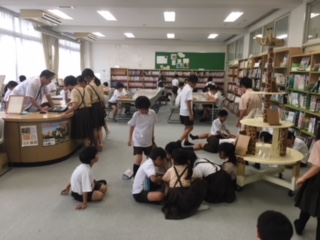 雨が降ると図書室にはたくさん本を読みに子ども達がやってきます。思い思いに本を読んでいます。紙芝居の読み聞かせをしている子達も!