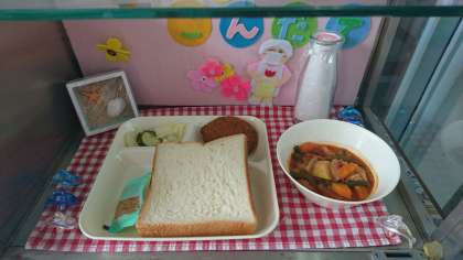 今日の献立は、チキンレバーカツ、ケチャップ煮、キャベツときゅうりのサラダ、食パン、リンゴジャム、牛乳でした。