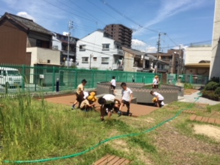 ビオトープの亀のいる池に川エビがたくさんいます。観察した後は、元に戻しています。「こんなに小さいのに、ヒゲがものすごく長いなぁ!!」など発言が、たくさんあります!!